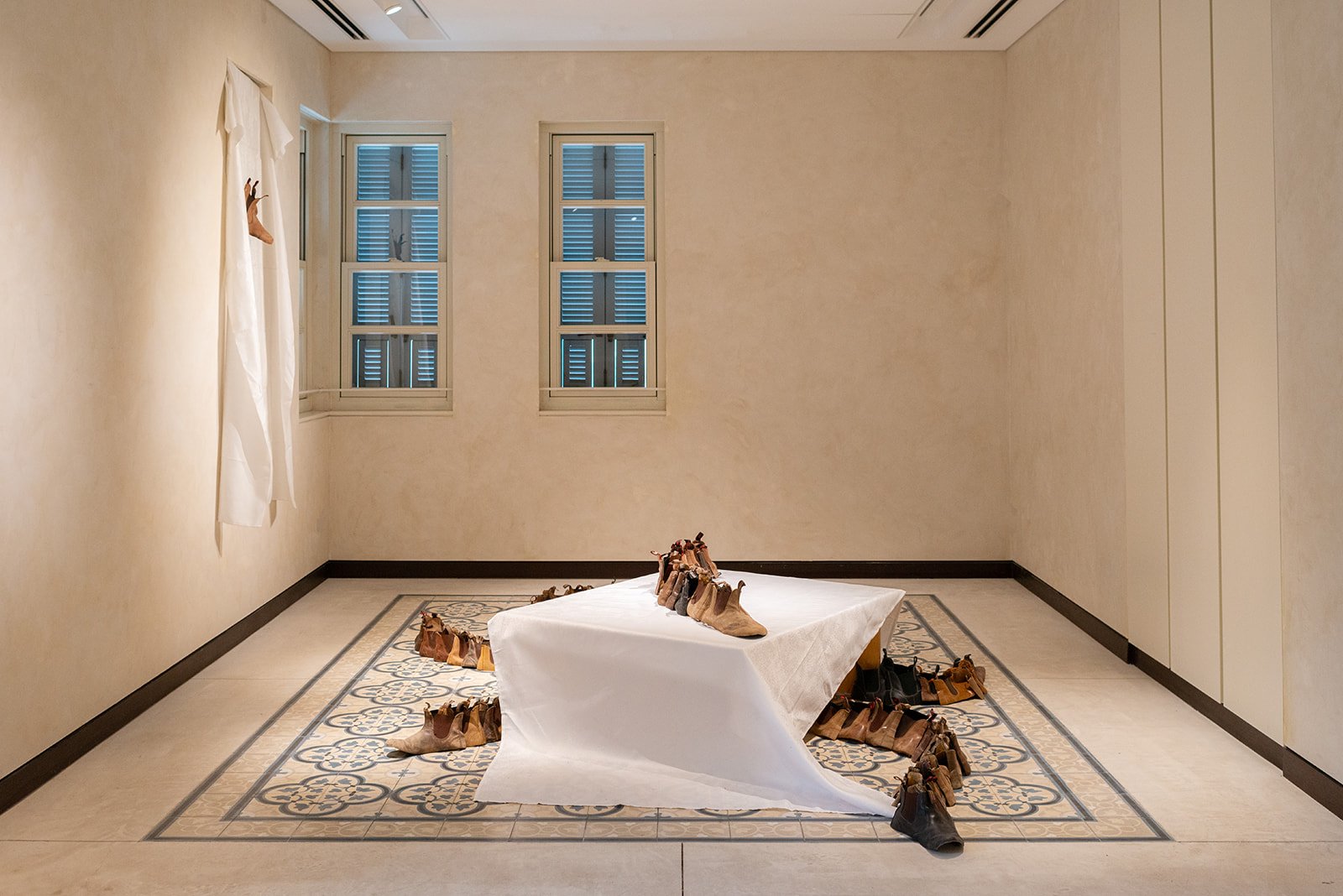 Multi-legged, Australian boots, white tablecloth